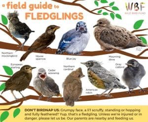 Baby birds are born in spring or early summer. Many birds in North America nest in May. Nestlings are recently hatched. They are usually blind and have few feathers. The nestlings eventually grow in their feathers and become fledglings. Mockingbirds become fledglings at 12 days old. Fledglings usually leave the nest before learning to fly. The parents are watching nearby, so they can check on the fledgling and bring them food.