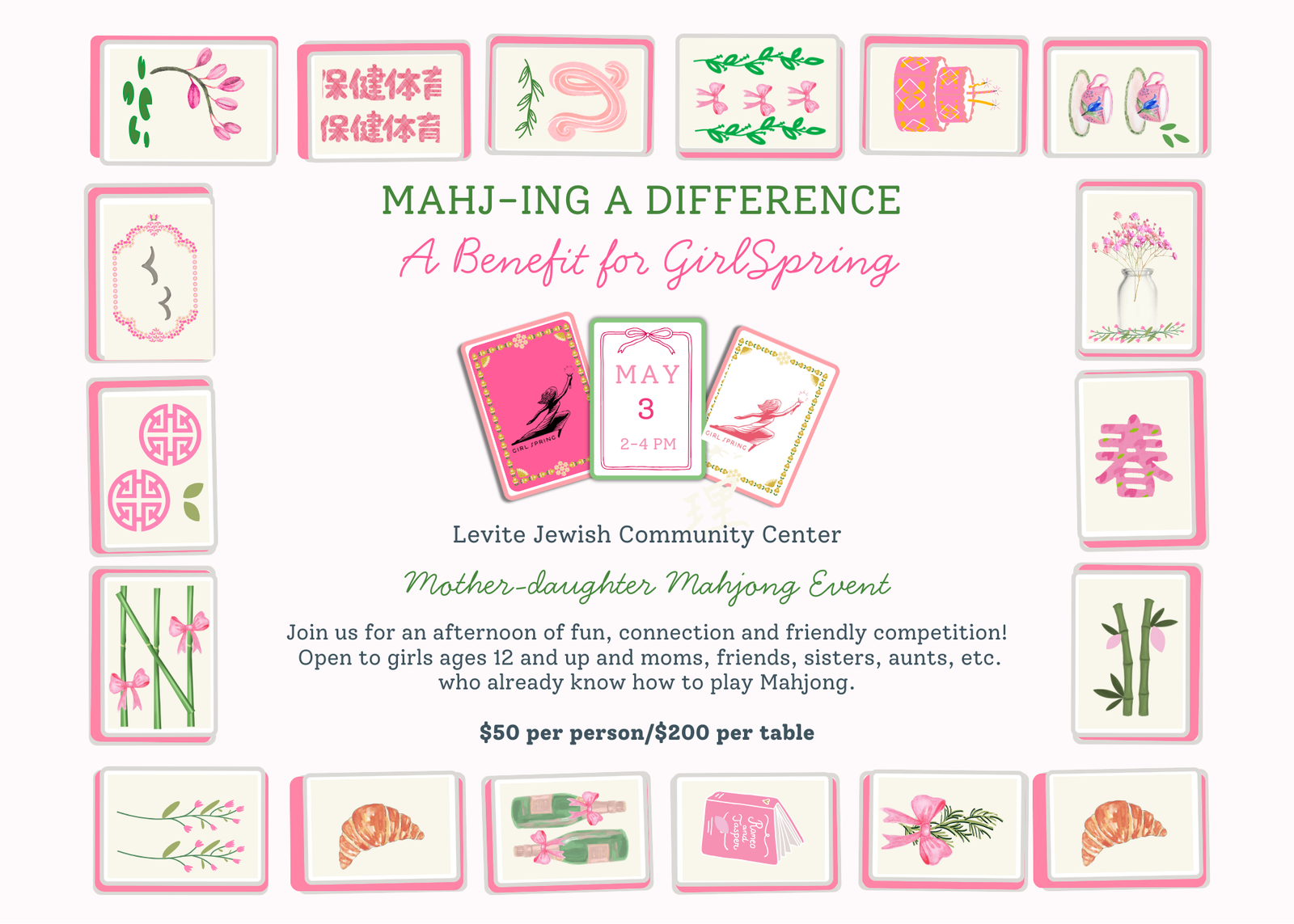“Mah-jing” a Difference, a mother-daughter Mahjong event will be on May 3 from 2-4 PM CDT at the Levite Jewish Community Center. Join us for an afternoon of fun, connection, and friendly competition, benefitting GirlSpring! Open to girls ages 12 and up and moms, friends, sisters, aunts, etc. from beginners to seasoned pros.