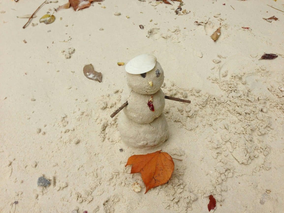 There were a few Christmas photo shoots going on near the shore. Some of them were funny photos with rolled up pant leg Santas standing near their Mrs. Claus or elf counterparts. The other half were serious families with large color coordinated outfits that would go in hanging frames or generational photo books. We just took selfie photos of our sandmen (or Sandmounds) and patted them into a mountain of shells and sticks before we left. We talked about who had the best one and “if they became magical, like Frosty”. Would it be called Sandy?
